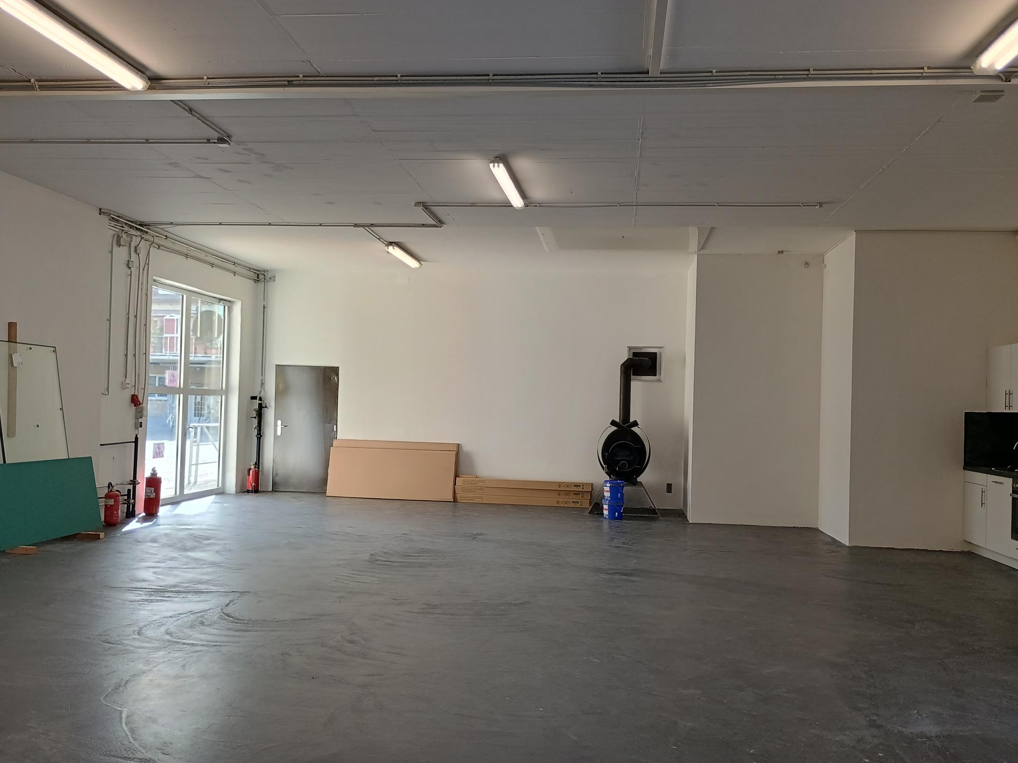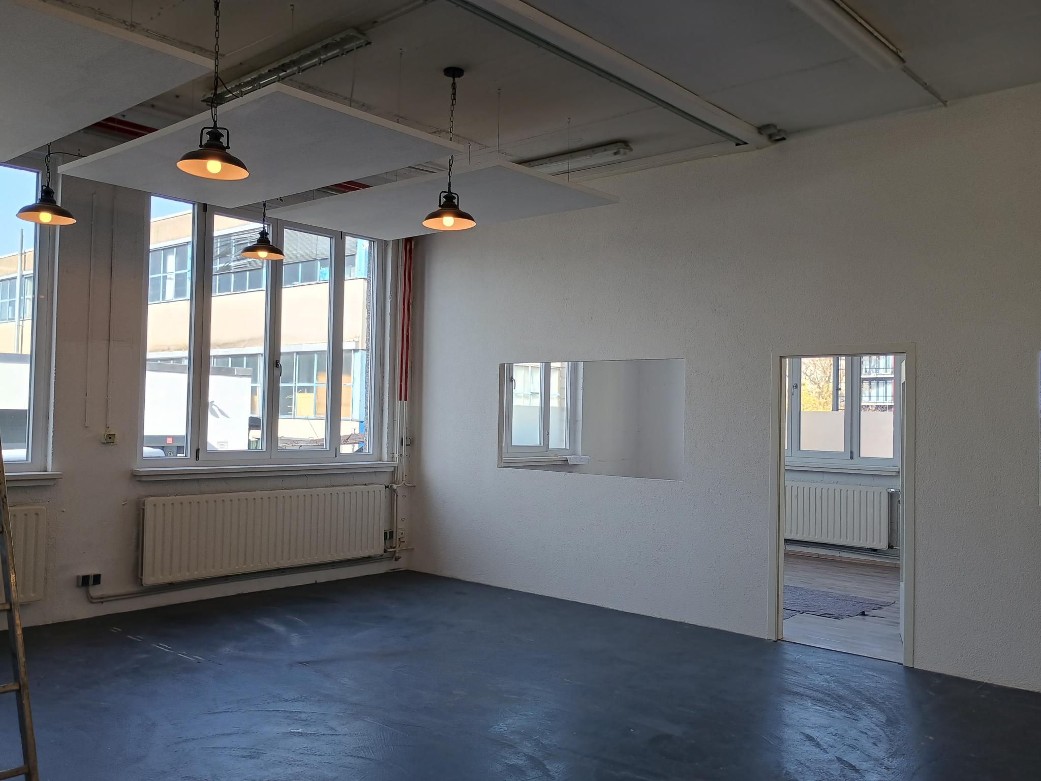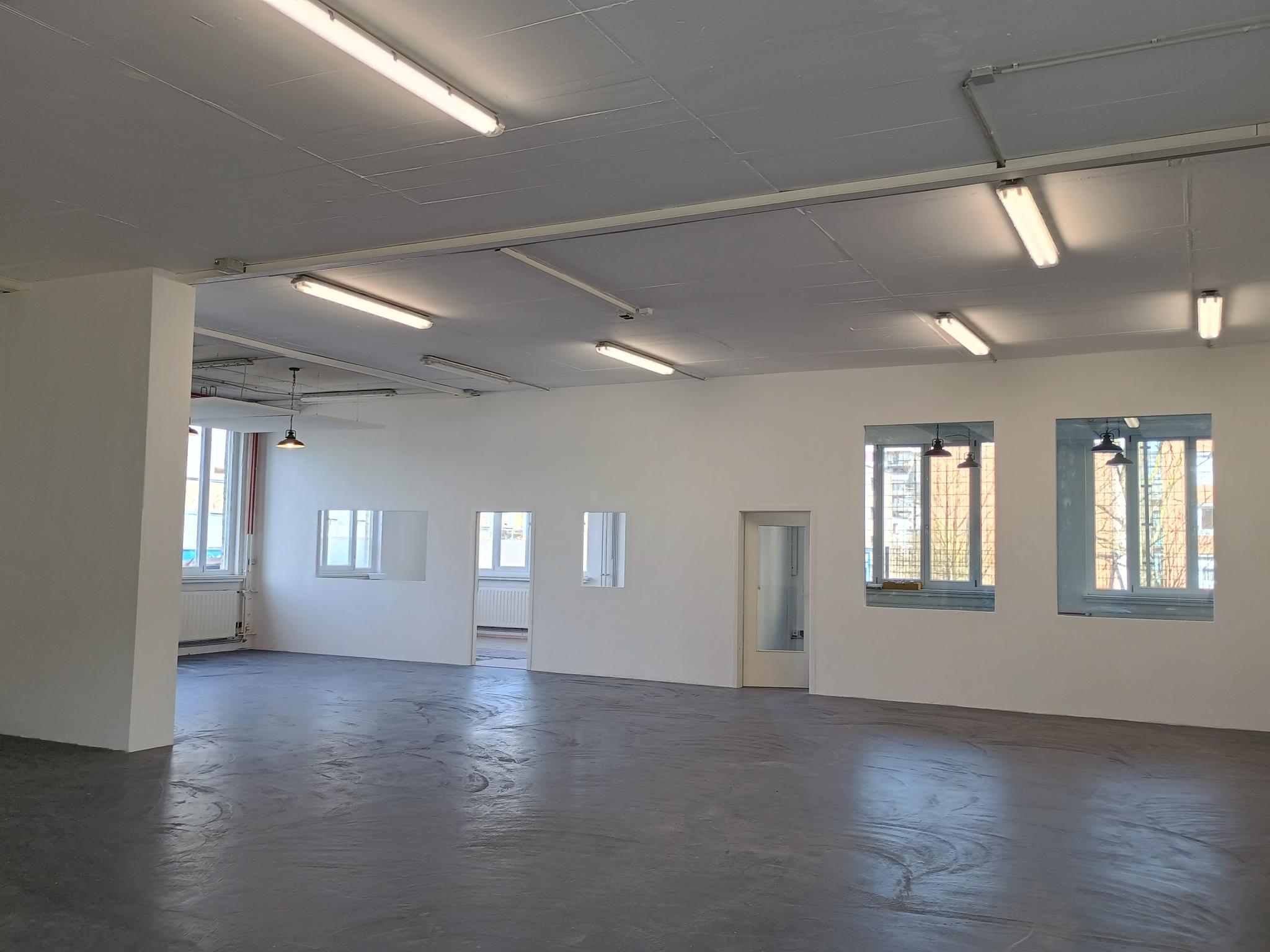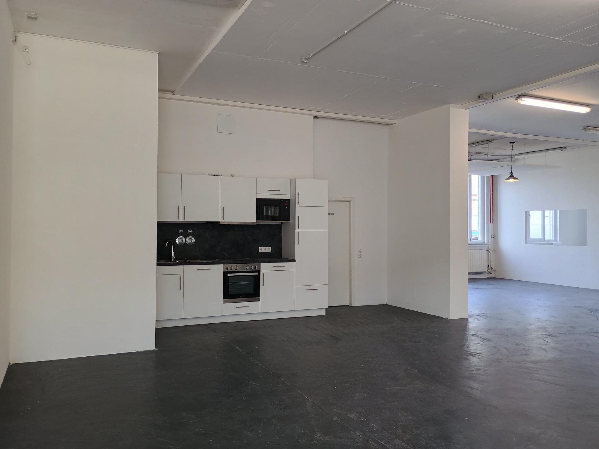 Die Fläche wurde 2026 renoviert, die Fenster erneuert und ist dadurch sehr hell. Der große Raum im Loft Style bietet zwei eingebaute Bürokabinen, die durch große Fenster zum Werkstattbereich hin offen und tageslichtdurchflutet sind. Das Hallentor bietet eine Höhe von 3m, die Flächen selbst haben eine Höhe von ca. 3,60m. Die Fläche wurde mit einer Küche und Starkstrom ausgestattet.
